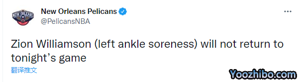 锡安又伤了,目前鹈鹕对外宣布胖虎的左脚踝酸痛,而不是脚踝扭伤,赛后鹈鹕主帅威利-格林应该会透露锡安的情况。