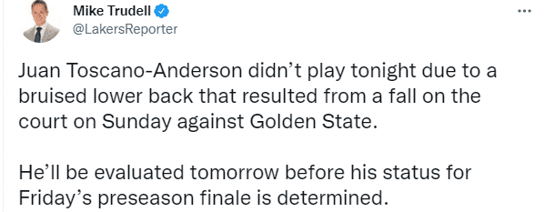 湖人另一新援胡安·托斯卡诺-安德森因伤缺席比赛,据湖人记者Mike Trudell报道,安德森因上一场对阵勇士时摔倒导致下背部受伤,缺席了今天的比赛。