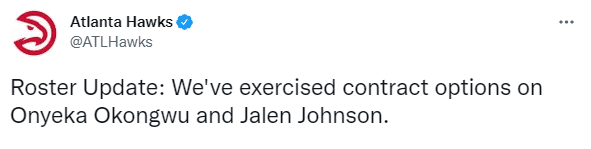 老鹰执行球队前锋杰伦-约翰逊的第三年(23-24赛季)球队选项。杰伦-约翰逊新赛季的薪水279万美元,23-24赛季的薪水为293万美元;上赛季约翰逊为老鹰出战22场比赛,场均2.4分1.2篮板,他是2021年首轮20号秀。