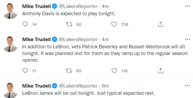 此前,詹姆斯为18岁大儿子布朗尼庆生,全家大开派对庆祝,而湖人也安排即将38岁的老詹休息一场。威少和贝弗利也不会出战,有趣的是贝弗利昨天还约战库里,自称做好准备,还询问库里打不打,结果库里最终出战,但贝弗利却被安排休息了。