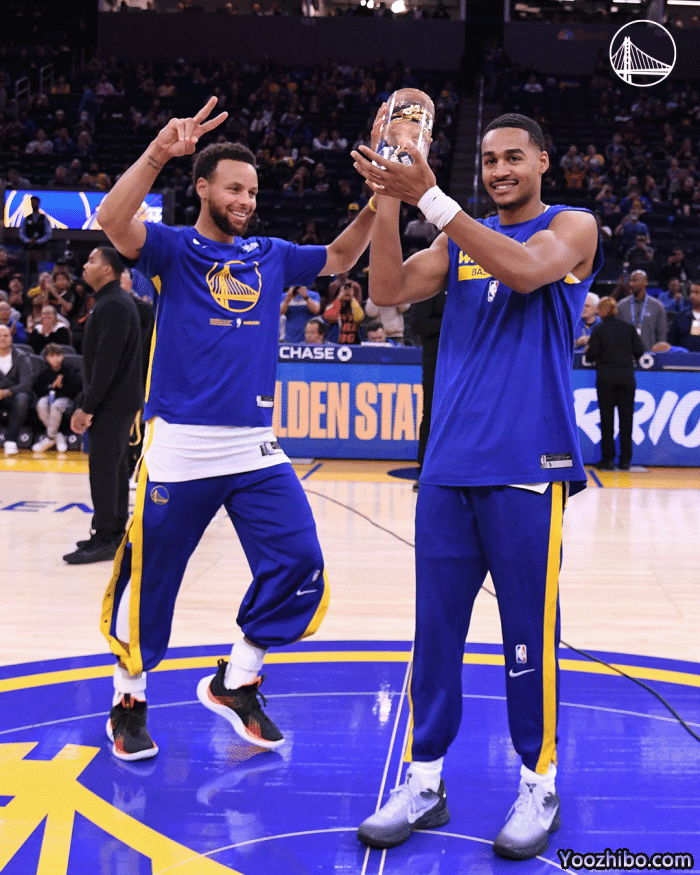 24直播网10月10日,NBA季前赛勇士主场对阵湖人,赛前,普尔正式领取罚球冠军奖杯,库里为队友颁奖并且站在普尔身后比2十分抢镜。