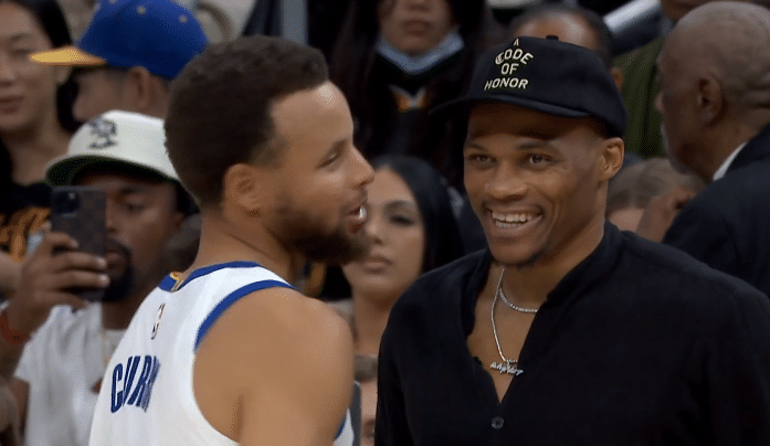 值得一提的是,上半场比赛暂停时,库里和威少在场边热聊,威少咧嘴大笑十分开心。