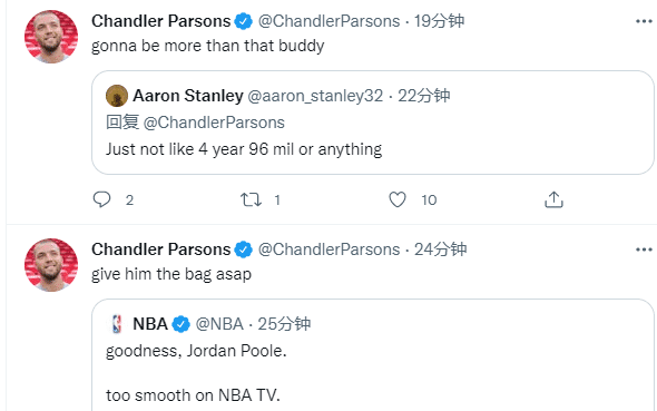 前NBA球员钱德勒-帕森斯发推谈写道:要尽快给他钱!有网友评论表示:不会像4年9600万这样的合同吧?