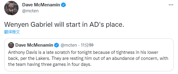 浓眉因伤缺战太阳,加布里埃尔将顶替浓眉首发出战,上一场比赛,加布里埃尔替补上场19分钟,8投3中拿到6分10篮板4盖帽;湖人官方删推并且再次变阵,新的首发五虎是詹姆斯、威少、贝弗利、加布里埃尔和里夫斯。