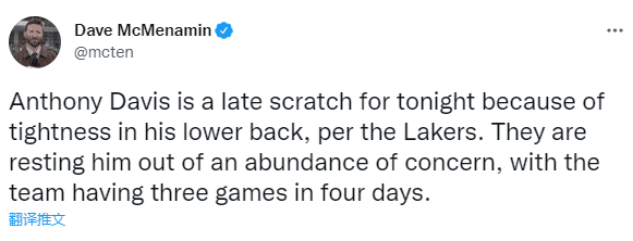 浓眉因下背部紧绷而缺席今天与太阳的比赛,湖人方面表示,这是预防性的措施,他们不想为了一场季前赛让浓眉冒险;据湖人记者Dave McMenamin报道,浓眉今天迟到了,湖人出于谨慎考虑让他休战,球队在4天内有3场比赛。