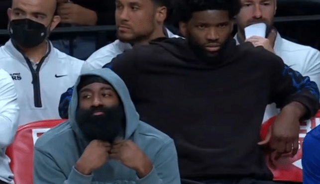 这场比赛哈登没有出战与老东家的比赛,他在场边和恩比德一起坐着,不断玩弄自己的胡子,正好今天NBA官方还发布了哈登的胡子对比照片,称:“哈登的第14个赛季!胡子多了也爱笑了”