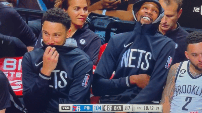 值得一提的是,末节篮网落后17分时,镜头给到篮网替补席,杜兰特和西蒙斯两大球星都咧嘴大笑,球队落后仍旧不影响他们的心情,当然了,这只是季前赛,输赢并不是最重要的。