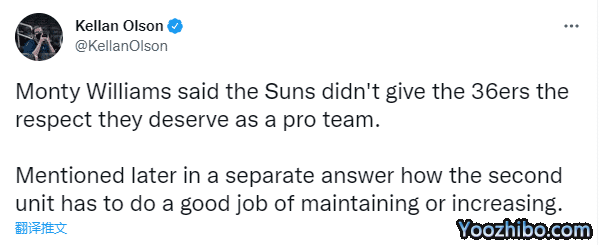 谈到本场失利时,太阳主帅蒙蒂-威廉姆斯表示:太阳没有给予36人作为一支职业球队应有的尊重,蒙蒂还表示替补阵容在维持比赛或提升比赛方面需要做得更好。