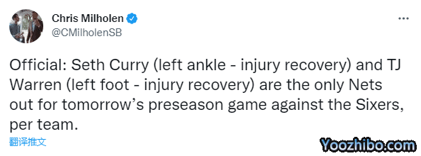 24直播网10月03日讯,篮网季前赛对阵费城76人的伤情报告出炉,篮网队两人因伤缺席比赛,赛斯-库里(左脚踝,伤病康复)和TJ-沃伦(左脚,伤病康复)因伤休战,篮网其他球员都可以出战;杜兰特、欧文和西蒙斯三巨头带队出战,西蒙斯迎来篮网生涯首秀。