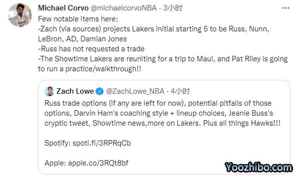 24直播网09月10日讯 ,名记扎克-洛维在节目中预测湖人新赛季首发五虎是詹姆斯、浓眉、威少、纳恩和达米安-琼斯;还爆料威少没有提出交易请求,湖人众将将在毛伊岛集训;另外湖人可用首轮签交易得到博扬,或引援神射填补阵容的漏洞。