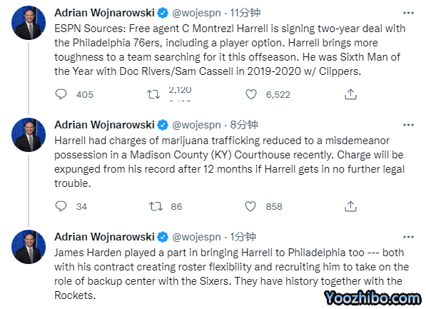 24直播网09月07日讯 ,据名记Woj报道,消息人士透露,自由球员哈雷尔已经与76人签下一份2年合同,合同中包含球员选项;哈登亲自招募哈雷尔,后者将担任76人替补中锋,新赛季助哈登、恩比德冲击总冠军。