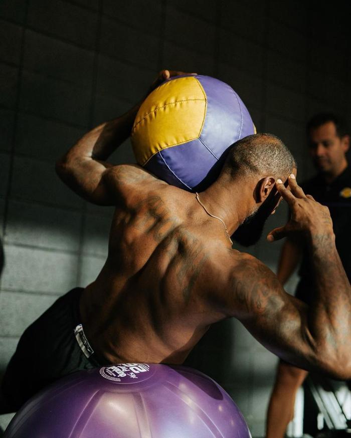 詹姆斯在健身房进行核心力量的训练,赤膊苦练凸显身材;即使老詹已经37岁了,他仍旧是联盟的楷模,不愧为自律第一人。
