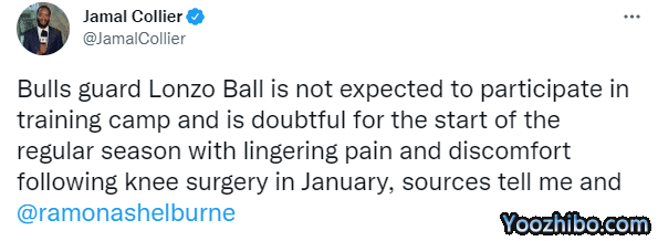 据美记者Jamal Collier报道,公牛后卫郎佐-鲍尔预计缺席新赛季训练营,常规赛开始阶段能否复出值得怀疑,鲍尔仍旧遭遇膝伤的困扰。