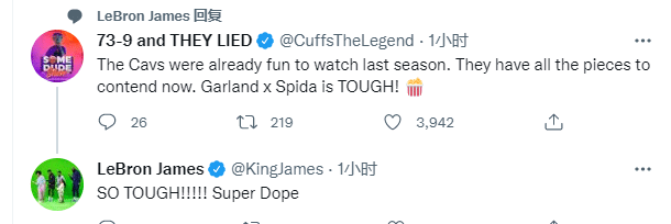 米切尔1换8加盟骑士引热议,加兰第一时间发推欢迎米切尔加盟,米切尔回应两个感叹号表情;篮网新援罗伊斯-奥尼尔发推:欢迎来到东部;美自媒体博主73-9 and THEY LIED发推写道:上赛季骑士已经很强了,现在他们拥有可以与其他球队抗衡,加兰和米切尔组合太强了,詹姆斯回复:太强了,超级令人兴奋。