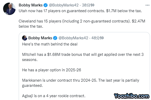 薪资专家Bobby Marks解读这一笔大交易,米切尔合同中包含168万美元的交易保证金,将分为3年发放,25-26年拥有球员选项;马尔卡宁合同将在24-25赛季到期,阿巴基拿着4年新秀合同;爵士拥有17名保障合同球员,低于奢侈税170万美元;骑士拥有15名保障合同球员,低于奢侈税247万美元。