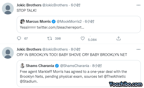 大莫里斯的弟弟发推祝贺哥哥加盟篮网,约基奇兄弟发推:别再说了;约基奇兄弟还直言:继续去布鲁克林哭泣吧!巨婴快去篮网抱头痛哭吧!