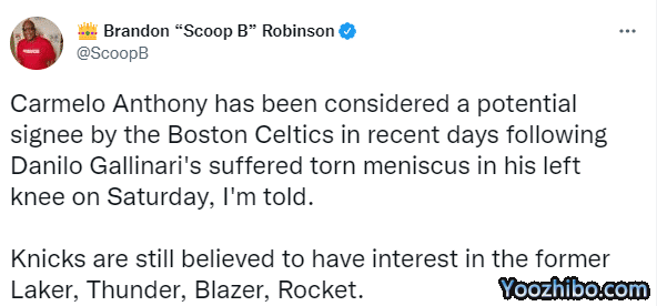 24直播网08月31日讯 ,休赛期至今,38岁的安东尼仍旧没有和任何球队签约,据名记Brandon Robinson报道,由于加里纳利遭遇左膝半月板伤病,凯尔特人有意签约安东尼,尼克斯也有意签回安东尼。