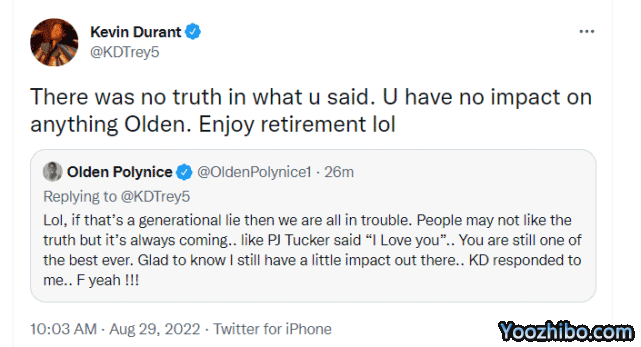 24直播网08月29日讯 ,杜兰特更新社媒,把矛头对准前NBA球员奥尔登-波利尼斯,目的就是为队友欧文辟谣。他表示波利尼斯说的是世纪谎言,并调侃这位前辈已经毫无影响力。