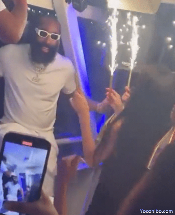 33岁的哈登身穿一套白色服装,戴着一副白色框架的墨镜,拿着话筒尽情享受生日派对,满脸笑容太开心,现场聚集了很多美女;当现场众人拿着香槟和蛋糕为他庆祝时,哈登接过蛋糕后直接把蛋糕扔进海里,对此有美媒调侃,哈登真的致力于减肥。