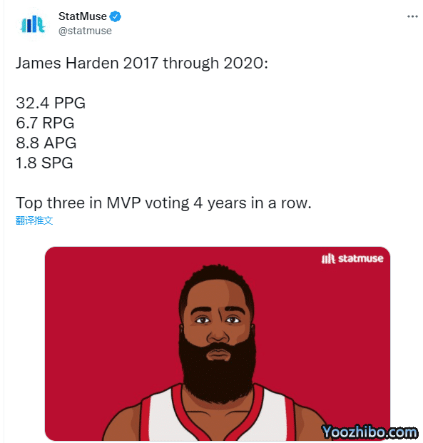 哈登生日夜,美媒Statmuse晒出哈登昔日的疯狂表现,2017-2020年期间的表现,哈登场均狂砍32.4分6.7篮板8.8助攻1.8抢断,连续四年MVP票选排名前三;生涯共5次单场轰下50分+三双,排名联盟历史第一,也是历史上唯一一位拿到60+三双的球员。