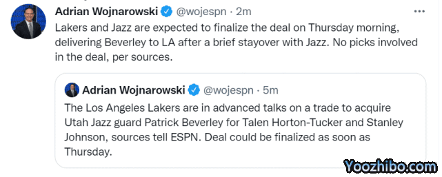 24直播网08月25日讯 ,据名记Woj报道,湖人和爵士达成了一笔2换1的交易协议,湖人送出霍顿-塔克和斯坦利-约翰逊,得到爵士的贝弗利。这笔交易不涉及选秀权,而贝弗利在此前戈贝尔的交易中被森林狼送到爵士。ESPN第一时间晒出贝弗利和詹姆斯的P图。正式交易预计在当地时间周四早上完成。