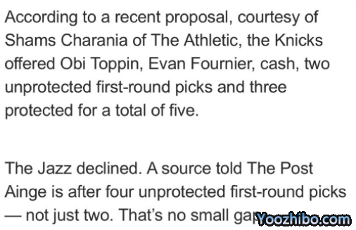 24直播网08月23日讯 消息,来自纽约名记马克·柏曼的报道,爵士拒绝了纽约尼克斯的一份疯狂报价!这份报价的内容是,尼克斯提供富尼耶+托平+现金,另外加上5个首轮签,以此来交易得到米切尔。原因是,5个首轮签中只有2个受保护,而爵士方面希望获得至少4个不受保护的首轮。