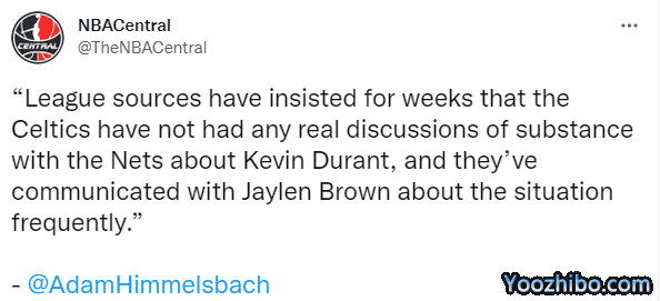 据绿军记者Adam Himmelsbach报道,联盟消息人士数周以来一直坚称,凯尔特人没有和篮网就杜兰特交易进行过任何实质性的讨论,他们经常与杰伦-布朗就这一情况进行沟通。