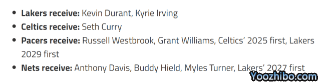 24直播网08月21日讯,美媒Lakeshowlife晒出了一笔4队8人的大交易方案,涉及湖人、凯尔特人、篮网和步行者4支球队8名球员,宣称可以各取所需。具体方案如下——
