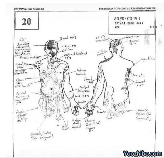 至于科比这边,情况更加的惨烈,为什么呢?在这一次公布的照片中,我们可以看到事故现场已经是一片凌乱,而科比那边的情况也是让人心疼,也是因为如此,在法庭上,科比这边的情况是用漫画还原出来的照片,可即便是漫画还原出来的照片,从漫画上,我们也可以看到科比缺少了一支手和腿,现场的情况可想而知。