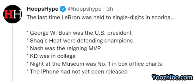 24直播网08月20日讯 ,勒布朗-詹姆斯决定在本周末前往西雅图打半职业联赛,为新赛季继续做准备。最近几天,他连续凌晨4点多开练,引起热议。美媒HoopsHype晒出了一条有趣的动态。勒布朗-詹姆斯上一次常规赛得分个位数是什么时候的事了?