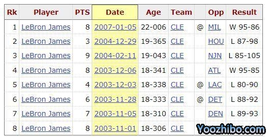 数据显示,詹姆斯常规赛生涯至今一共只有8次得分没上双。最近的一次已经是2007年1月5日的事了,在客场对雄鹿的比赛中,詹姆斯只得到8分。从那以后,詹姆斯连续得分上双的纪录一直延续至今,突破千场,已经成为NBA最难被打破的纪录之一。