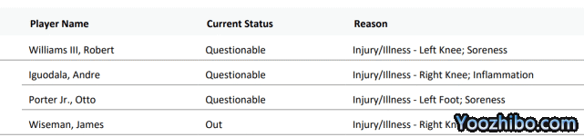 24直播网06月16日讯 ,NBA官方公布了总决赛G6的伤病名单。绿军一方,罗伯特-威廉姆斯因膝盖酸痛出战成疑(questionable,上场可能50%),勇士一方,怀斯曼继续因膝伤缺阵,波特左脚酸痛、伊戈达拉右膝炎症,也同样是出战成疑的状态。