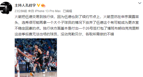 名嘴孔祥宇表示:火箭把伍德交易到独行侠,因为伍德也到了续约节点上,火箭显然在申京展露苗头、选秀很可能再拿一个大个子球员的情况下放弃了伍德这个有可能成为更衣室不稳定因素的点。独行侠方面基本是付出一个26号签打包了博班布朗伯克克里斯这些季后赛无法出场的球员,没动克勒贝尔、各取所需做的不错。