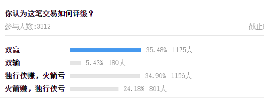 针对这比大交易,有媒体在网络上发起投票,称“你认为这笔交易如何评级?”吸引了数千球迷的参与。显示大部分的球迷觉得是双赢的结果,独行侠和火箭都有不错的斩获。当然也有不少人觉得独行侠赚,火箭亏,毕竟独行侠的内线补强了,而火箭得到了的是一众边缘球员。不过,整体上来看,火箭和独行侠都有斩获。