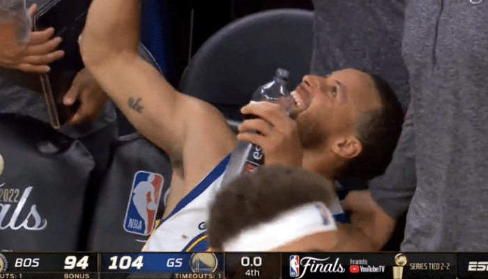 总决赛前四场,库里扛着勇士前进,而G5面对凯尔特人的贴防和围剿,库里被限制住,但维金斯、汤普森等球员挺身而出,相当于让库里躺赢一场;勇士赢球赛后,库里斜躺在替补席哈哈大笑,满脸笑容早已笑得合不拢嘴,他真的太开心了。