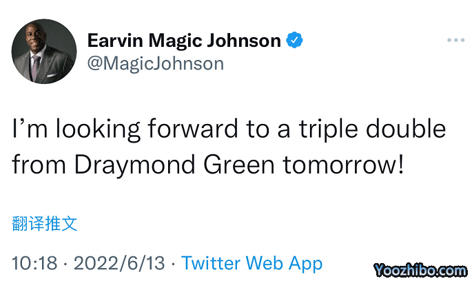 赛前NBA传奇魔术师约翰逊在社交媒体上预测追梦格林,称:期待追梦格林在天王山战役轰下三双。