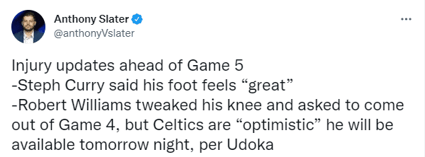 库里已经不在勇士伤病名单上,确定出战天王山;总决赛G5奥托-波特和伊戈达拉被列为出战成疑,怀斯曼继续休战,凯尔特人则是罗威出战成疑。
