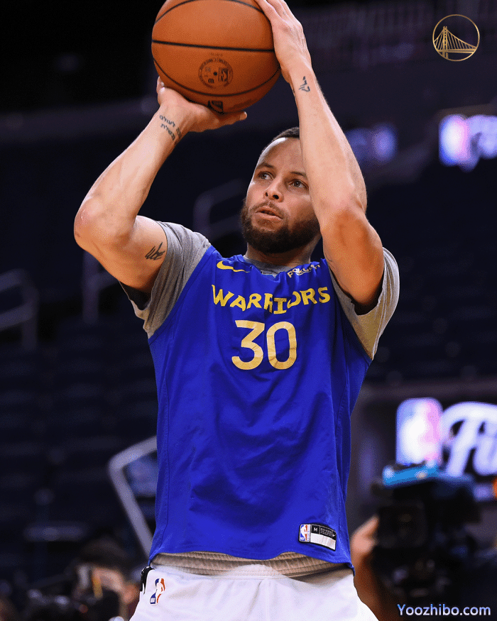 在训练师的配合下,库里训练三分定点投篮,分别在两侧底角、两侧45度和弧顶远投三分,每个点投进两球;第一场尝试时,库里最后一个底角三分打铁不中,怒吼一声后重新来过,绕着外线依次投篮,连续命中10记三分后才结束这样的投篮训练。