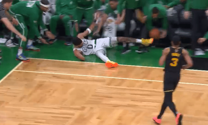 此时,场上再度出现非常铁血的一幕。塔图姆背后掏球抢断,但用力过猛,皮球眼看就要飞出边线。塔图姆随后直接倒地飞扑,只可惜救球无果。但这次救球,塔图姆直接从中线附近滑到了底线附近,滑行距离接近10米。这一场面也赢得了全体球迷雷鸣般的掌声,大大鼓舞了绿军士气。