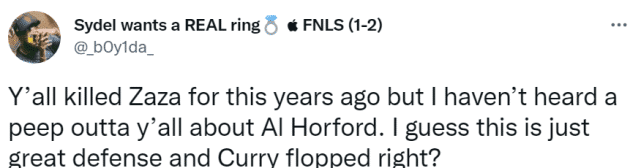 24直播网06月10日讯,总决赛G3一战,霍福德先是在防守库里三分时,被吹了一级恶犯,随后又在末节的一个回合中压伤了库里的左脚。一个球迷晒出了霍福德一级恶犯的那个回合,并配文写道:“几年前,你们因为这样的行为要杀了扎扎(帕楚利亚),但我却没有听到你们说霍福德,我猜这是伟大的防守,库里假摔?”
