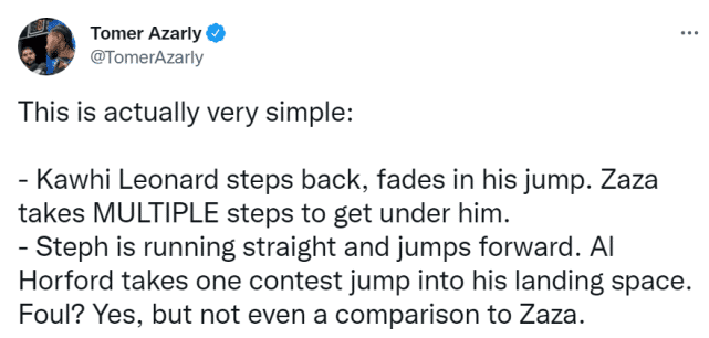 快船记者Tom Azaly晒出了两个回合的慢动作,并为这位球迷给出了解释。“这实际上非常简单。科怀-莱昂纳德后撤步,后仰跳投,扎扎朝着他的脚下连走了好几步。斯蒂芬(库里)是向前跑动出手三分,有一个向前跳的动作。霍福德只是伸手封盖这个球,正好跳进了库里的落地区域。犯规?是的,但跟扎扎那个动作是没有可比性的。”