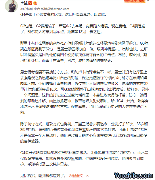 很显然,在1-2落后的被动局面下,科尔需要调整的地方有很多,但时间上并不允许,不同于前几场比赛中间休息的时间都是2天,G3和G4之间仅仅相隔1天,很难说科尔在这期间会令球队发生多大的变化,已经让球员的状态有多大的提升,更多的还是靠着日常的点拨和球员们自己的调整。当然战术和用人层面还是需要科尔考虑的,比如卢尼和追梦格林的使用情况等等。