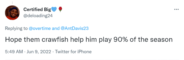 视频中,浓眉一边剥着小龙虾,一边和主持人开心聊天。2021-22赛季,浓眉因伤只打了40场常规赛,2020-21赛季,他也只打了36场常规赛。连续两年明显遭遇伤病困扰,也让湖人球迷对他的前景表示担忧。有球迷调侃道:“希望这些小龙虾能帮他明年打90%的比赛,”“希望剥小龙虾时别把手腕给扭了。”还有球迷写道:“(吃小龙虾)而不是把注意力放在球场上。”