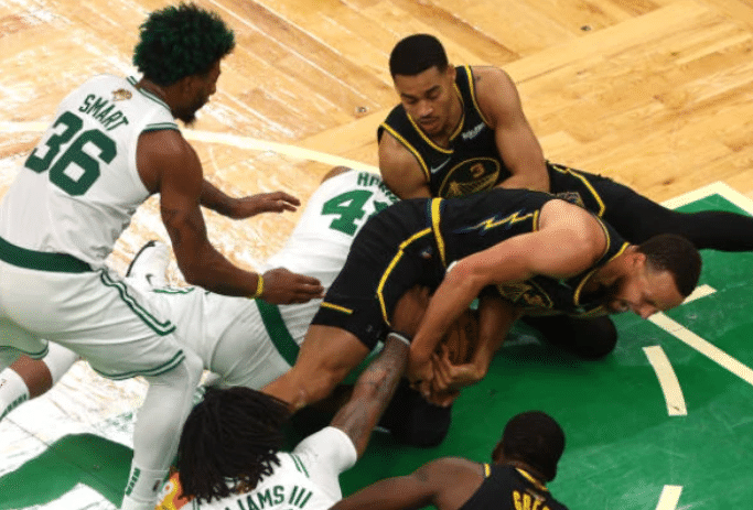 末节还剩4分多钟,塔图姆迎着汤普森中投打铁,斯玛特、罗威和格林几乎同时倒地拼抢地板球,然后库里和霍福德倒地抢球,普尔也过来冲抢,斯玛特起身后趴在库里身上争抢,现场一片混乱,多达6名球员倒地拼抢,对此裁判一直没响哨,最终斯玛特抢到球权,格林推倒斯玛特吃到第6犯,犯满毕业而下场。