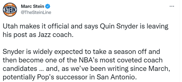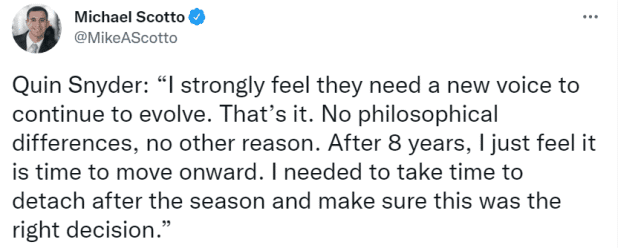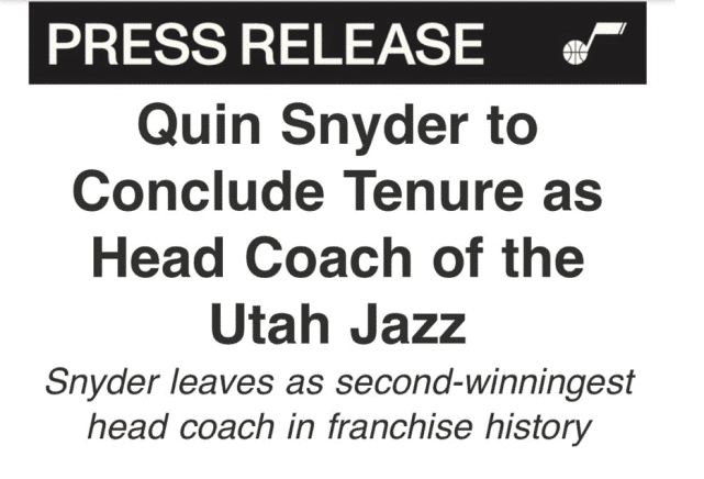 斯奈德通过球队发表了一份声明,在声明中他表示“是时候”离开了。斯奈德在声明中写道:“每天驱使我的动力,是我们的球员和他们对比赛的热情,他们不断努力进步的愿望,以及他们对爵士的奉献精神……我强烈认为他们需要一个新的声音来继续成长,仅此而已,没有其他原因。八年过去了,我只觉得是时候继续前进了。我在赛季结束后花了一些时间思考,确保自己做出了一个正确的决定。”