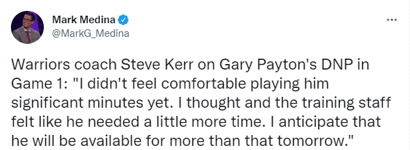 目前勇士大比分0-1落后凯尔特人,总决赛G2将在明天开打,预计小佩顿能够获得上场时间,他告诉科尔自己准备好了,科尔表示会给佩顿上场的机会。