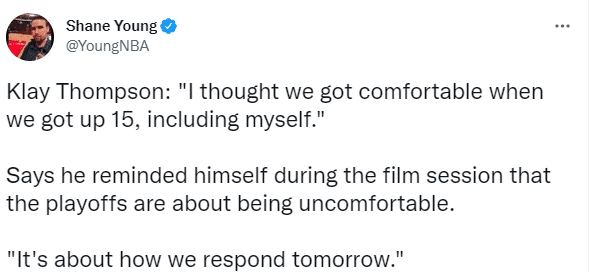 谈到G1输球,汤普森表示:我们在G1的第三节结束后,已经很轻松地取得了领先,我认为我们在领先15分时感觉很舒服,包括我自己,但季后赛在完成任务之前不该有这种感觉,这关系到我们明天如何应对;在季后赛中,你的脚不能离开油门一秒钟,这是一个残酷的教训,现在我们要开始第二场比赛了,我们明天会拼尽全力。