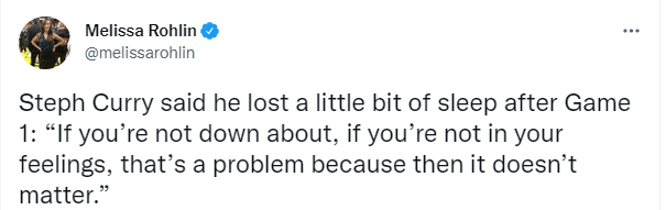 再次谈到G1输球,库里表示:我在第一场比赛后有一些失眠,如果你不为此感到沮丧,你的情绪也不感到低落,那就有问题了,因为这似乎是无关紧要的一件事。