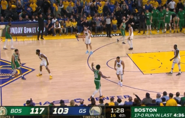 直接回到第四节,绿军带着12分的劣势进入末节。此前三节发挥糟糕的杰伦布朗挺身而出,他先是连得5分,随后助攻队友拿下4分,接着自己再连得5分,帮助凯尔特人追到只差4分。怀特随后连中两记三分,霍福德再中两记三分,凯尔特人已经109-103反超6分。接着轮到斯玛特飚中两记三分,最后阶段霍福德2+1再中,让凯尔特人本场得分锁定在120分!