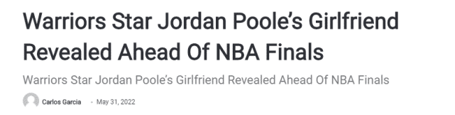 消息人士透露,乔丹-普尔目前正在和金-克鲁兹约会,他们已经在一起几个月了。金-克鲁兹经常在社媒上分享自己的美照与生活,其中也包括在勇士主场观战的画面。